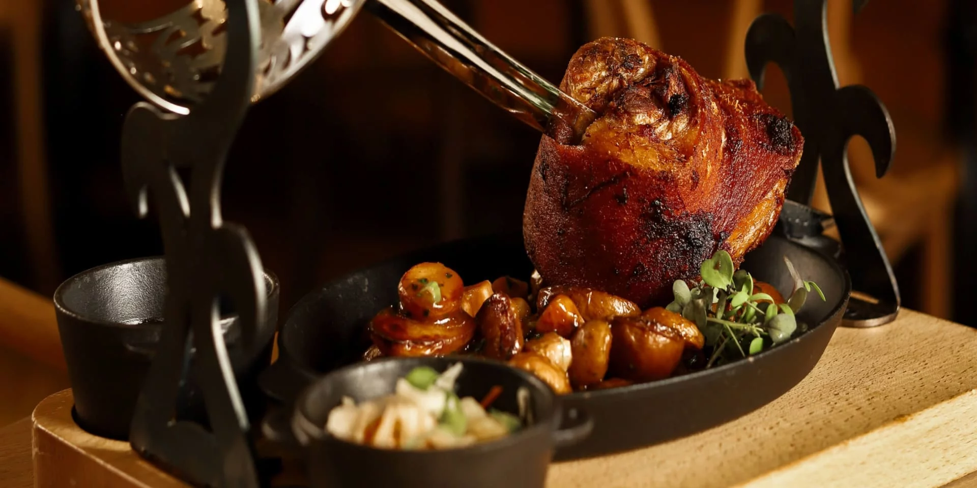 Közkedvelt signature ételünk egy igazi gasztronómiai remekmű, melyet hosszú órákon át gondosan készítünk, hogy kiváló minőségű ételt szolgálhassunk fel. A malaccsülök kettős karaktere magával ragadó: kívül ropogós, belül omlós és vajpuha.