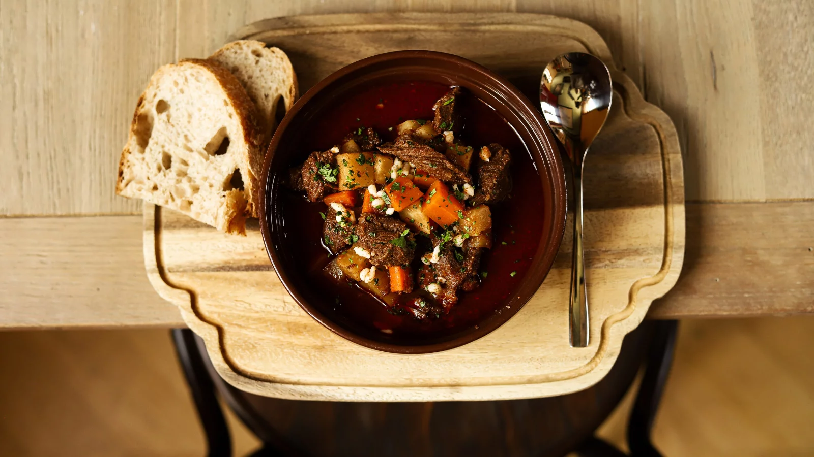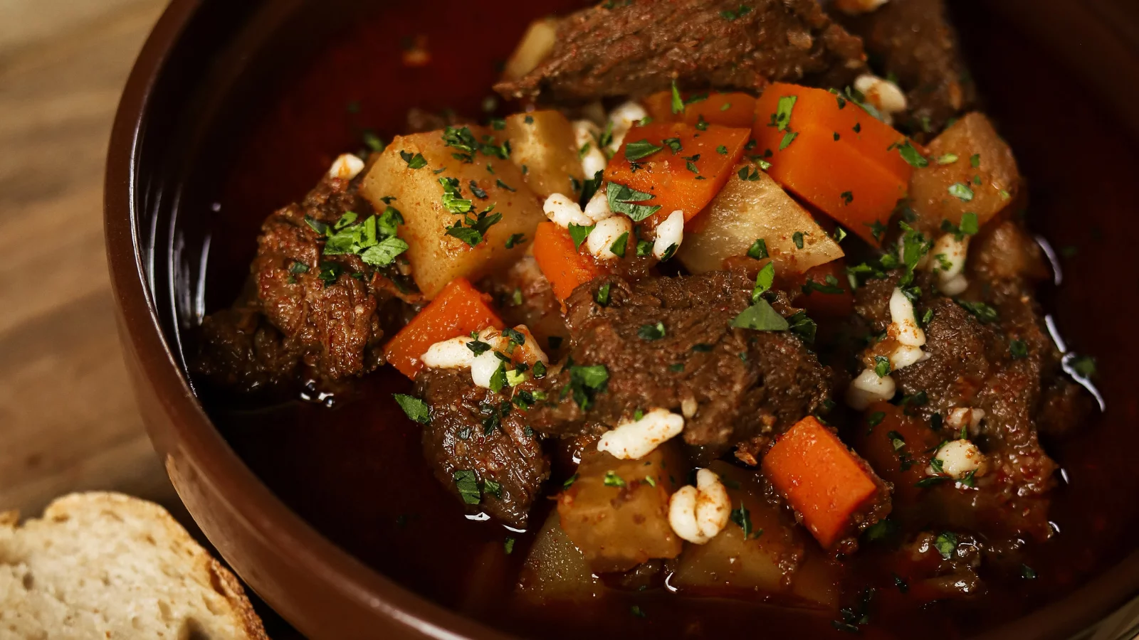 Tradícionális marhagulyás tálban, friss házi kenyérrel